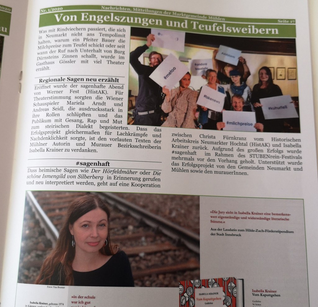 Eröffnet wurde der sagenhafte Abend von Werner Fest (HistAK). Für Theaterstimmung sorgten die Wiener Schauspieler Mariela Arndt und Andreas Seidl, die ausdrucksstark in ihre Rollen schlüpften und das Publikum mit Gesang, Rap und Mut zum steirischen Dialekt begeisterten. Dass das Erfolgsprojekt gleichermaßen für Lachkrämpfe und Nachdenklichkeit sorgte, ist den vorlauten Texten der Mühlner Autorin und Murauer Bezirksschreiberin Isabella Krainer zu verdanken.