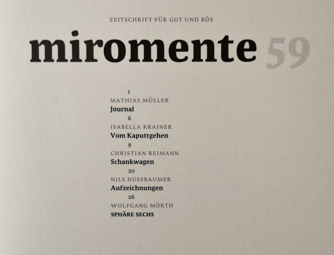 Die Vorarlberger Literaturzeitschrift „miromente“ begleitet mich seit meiner ersten literarischen Veröffentlichung. Um so mehr freue ich mich, dass sich in der aktuellen Ausgabe nun auch ein Auszug aus meinem ersten Lyrikband lesen lässt. Der Kreis schließt sich. Vorerst.