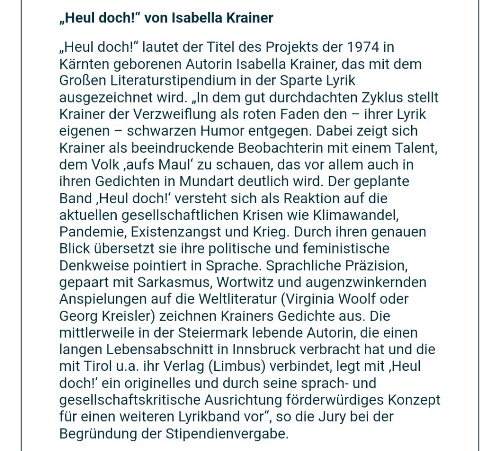 Großes Literaturstipendium des Landes Tirol Veröffentlicht am 16. April 202315. Mai 2023 von Autorin Verschlagwortet mit 2023/24, Großes Literaturstipendium, Lyrik, Tirol GEWONNEN! ❤️❤️❤️ Großes Literaturstipendium des Landes Tirol 2023/24 in der Sparte Lyrik. Unfassbare Dankbarkeit ❤️! Ähnliche Beiträge